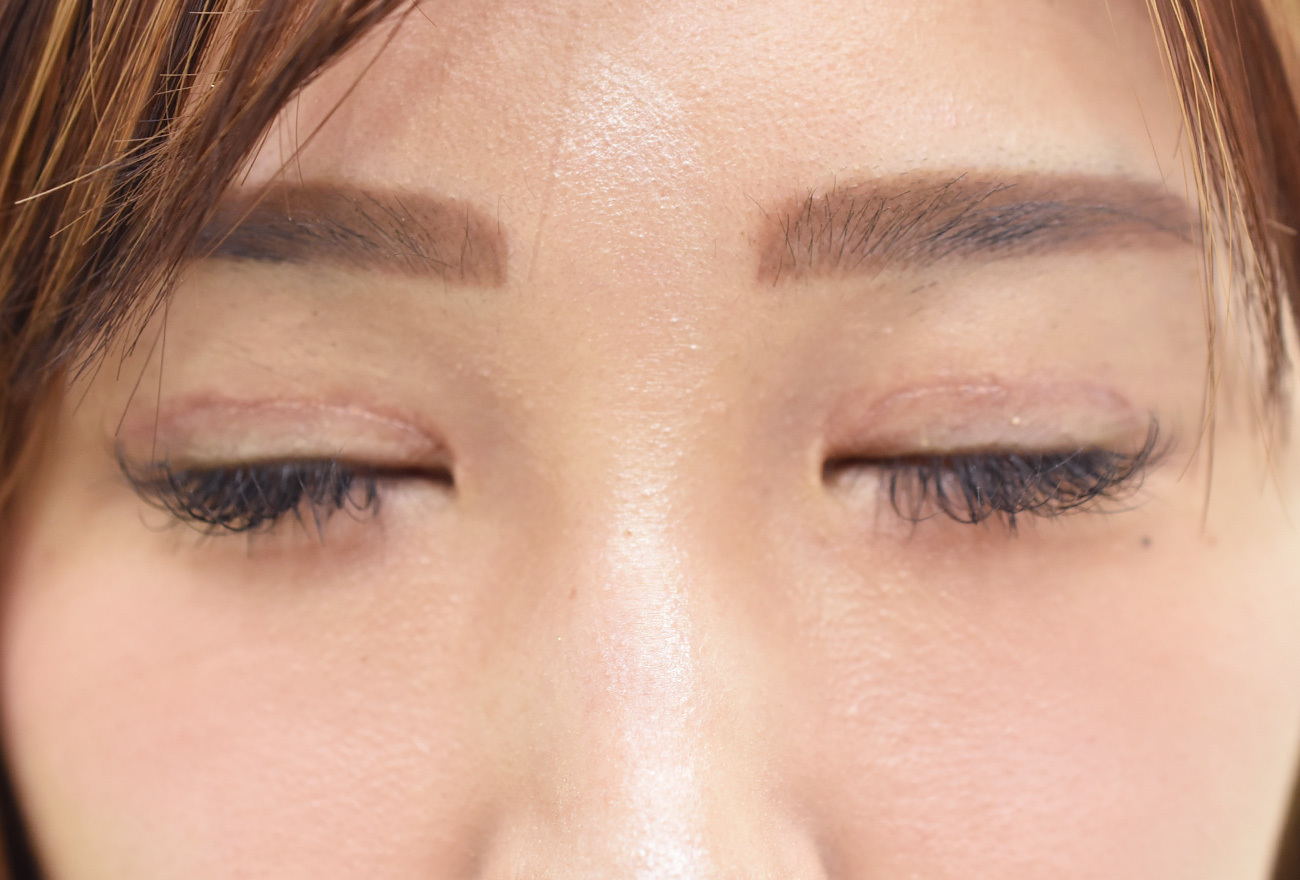 20代 女性の全切開法症例です。 他院にて全切開法+挙筋短縮を受けましたが、ハム目、二重幅の左右差、目の開きずらさを改善したいとの希望にて来院されました。目の開きにくいのは、ハム目が原因と考え重瞼ライン下の余剰皮膚を切除しています。