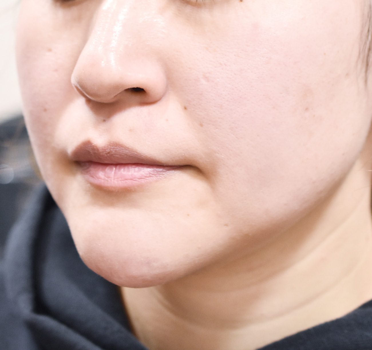 下顎骨はブーメラン型で最大幅6.5mm幅、脂肪吸引量は右6cc(顎先も含む)、左4cc行っています。